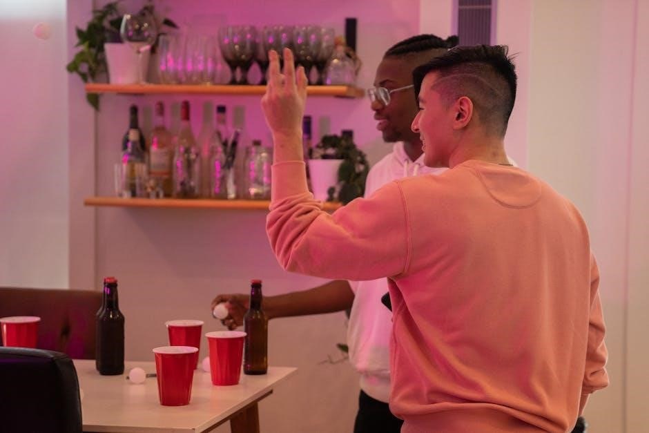 Psychological tactics play a crucial role in beer pong, often separating good players from great ones․ Players can gain an edge by employing mental strategies to distract or intimidate opponents․ Trash talk, intimidating stares, and exaggerated celebrations can disrupt opponents’ focus․ Maintaining a calm and confident demeanor under pressure can also unsettle rivals․ Additionally, using positive reinforcement with teammates and negative commentary toward opponents can shift the game’s momentum․ Mastering these psychological tactics can reduce opponents’ confidence and enhance your team’s performance, making them a powerful complement to physical skill․